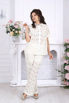 Джемпер — это голос комплекта, его эмоциональный акцент. Прилегающий силуэт обнимает тело, подчёркивая естественную грацию. Печать «Леопард» на полочке — дерзкий штрих, как вспышка характера. Обработка горловины и низа распошивалкой — это штрихи мастерства, завершающие образ с изяществом.