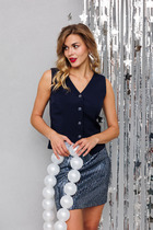 Нарядная блузка выполнена из мягкой трикотажной сетки в пайетки. Блузка полуприлегающего силуэта с драпировкой по полочке. Горловина в блузке v-образной формы, по низу разрез. Рукава в блузке втачные, одношовные, по низу рукава две декоративных складки. Низ изделия и низ рукавов обработаны бейкой, застроченной на 0,7 мм.