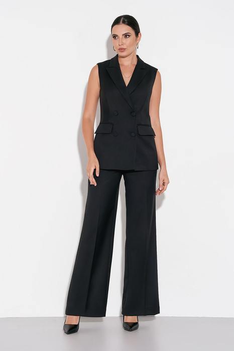 Женский деловой костюм, состоящий из жилета и брюк, выполнен из костюмной ткани высокого качества. Жилет классический двубортный полуприлегающего силуэта на подкладке с функциональными прорезными карманами по переду, воротником пиджачного типа и застежкой на петли и пуговицы. Брюки классические со стрелками полуприлегающего силуэта в области талии и бедер, прямые к низу. Брюки застегиваются на молнию, петлю и пуговицу.