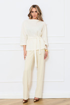 Женский деловой костюм, состоящий из жилета и брюк, выполнен из костюмной ткани высокого качества. Жилет классический двубортный полуприлегающего силуэта на подкладке с функциональными прорезными карманами по переду, воротником пиджачного типа и застежкой на петли и пуговицы. Брюки классические со стрелками полуприлегающего силуэта в области талии и бедер, прямые к низу. Брюки застегиваются на молнию, петлю и пуговицу.