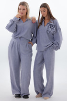 Костюм женский изготовлен из трикотажной ткани.Низ жакета, рукава и край борта обработан довязом. Жакет имеет v-образный вырез. Застёгивается на четыре петли пуговицы.