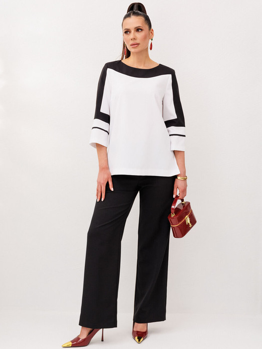 Костюм костюм женский блуза и брюки прямого силуэта, выполнено из текстильного полотна плательной группы с использованием двух цветов ткани.