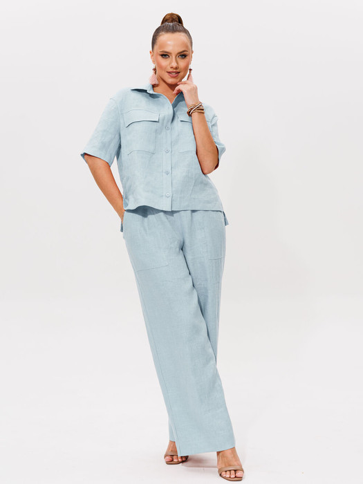 Льняной костюм двойка отличный выбор для женщин которые ценят комфорт и стиль.Этот комплект состоит из рубашки и брюк, идеально подходит для жарких дней. Рубашка прямого силуэта с воротником стойкой и застёжкой на петли и пуговицы. По переду имеются накладные карманы.