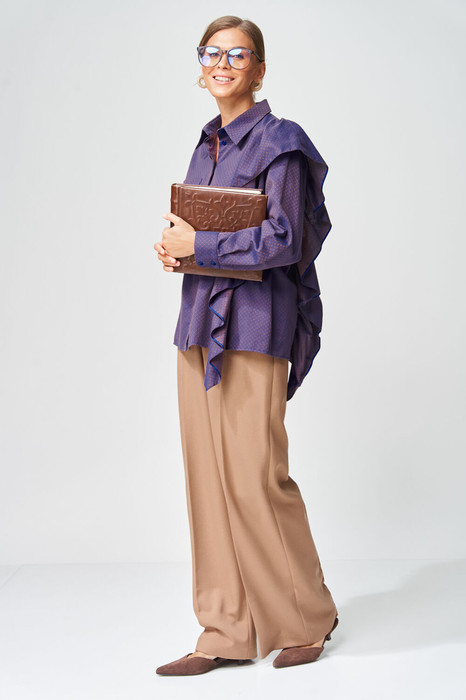 Костюм состоит из блузки (рубашки) и брюк. Рубашка прямого силуэта выполнена из хлопковой ткани с оригинальным жаккардовым переплетением. Перед с центральной застежкой потайной планкой. Левая часть переда и спинка с воланом на сборке вставленном в рельеф. На правой части переда настрочен карман. Рукав втачной одношовный с манжетой по низу, на манжете застежка на 2 петли и пуговицы. Воротник отложной со стойкой. Брюки расширеные книзу с притачным поясом выполнены из костюмной ткани. В поясе по бокам вставлена резинка. По передней и задней частям брюк вытачки и заутюжены стрелки. Спереди застежка гульфик на молнии и пуговицей на поясе. Фурнитура может быть изменена с сохранением художественного образа. Длина рубашки - 65 см, длина рукавав рубашки - 53 см. Длина брюк по боковому шву без учета пояса- 106 см.