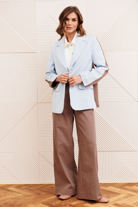 Костюм состоит из жакета и брюк. Жакет прямого силуэта сзади с имитацией куртки выполнен из хлопковой джинсовой ткани. Застежка  однобортная на 2 петли и  пуговицы. Воротник пиджачного типа.   Перед с талиевой вытачкой, рельефом и декоративным клапаном. Спинка скокеткой и складкой.  Рукав втачной двухшовный. Низ спинки и нижней части рукава собраны на резинку. Брюки расширеные книзу на притачном поясе. По поясу настрочены шлевки. По передним и задним частям брюк вытачки. На задних частях брюк настрочены карманы. Карманы, вытачки, пояс, низ брюк отделаны отделочной строчкой. Длина жакета - 70 см, длина рукава  - 60 см. Длина брюк с учетом пояса -107 см.