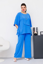 Костюм состоит из жакета и брюк из джинсовой хлопковой ткани. Жакет полуприлегающего силуэта с воротником пиджачного типа. Застежка однобортная на две пуговицы. Перед с талиевой вытачкой, рельефом и декоративным клапаном. Спинка с рельефами из проймы и средним швом. Рукав втачной двухшовный. Брюки расширеные книзу на притачном поясе. По поясу настрочены шлевки. По передним и задним частям брюк вытачки. На задних частях брюк настрочены карманы. Карманы, вытачки, пояс, низ брюк отделаны отделочной строчкой. Длина жакета - 68см, длина рукава жакета - 60 см, длина брюк с учетом пояса -107 см