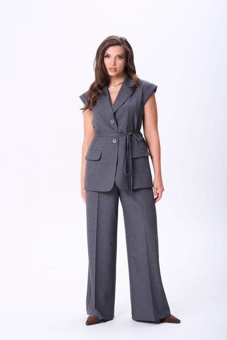 Костюм состоит из жилета и брюк, выполеных из костюмной ткани. Жилет полуприлегающего силуэта с воротником пиджачного типа. Перед с рельефами, талиевой вытачкой и декоративным клапаном. Застежка центральная однобортная на 2 петли и пуговицы. Спинка со средним швом и рельефами. Вдоль оката рукава выполнена декоративная планка. К жилету прилагается тонкий пояс из основной ткани. Брюки расширеные книзу с притачным поясом. Спереди застежка гульфик на молнии и с петлей и пуговицей по поясу. По задней частям брюк вытачки. В боковых швах карманы с наклонным входом. По поясу широкие шлевки. Брюки со срелками застроченными по переду и заутюженными сзади. Длина жилета - 71 см, длина брюк с учетом пояса - 109 см.