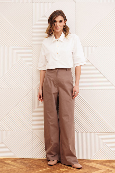 Джемпер прямого силуэта с воротником поло. Рукав втачной одношовный. По низу изделия, по низу рукава и по воротнику проложена отделочная строчка. Брюки расширеные книзу на притачном поясе. По поясу настрочены шлевки. По передним и задним частям брюк вытачки. На задних частях брюк настрочены карманы. Карманы, вытачки, пояс, низ брюк отделаны отделочной строчкой. Длина брюк с учетом пояса - 109 см, длина джемпера- 66 см, длина рукава - 30 см,