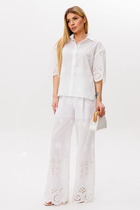 Джемпер прямого силуэта с воротником поло из плотной хлопковой ткани "двухнитка". Рукав втачной одношовный. По низу изделия, по низу рукава и по воротнику проложена отделочная строчка. Брюки палаццо с притачным поясом из мягкой вельветовой ткани. Спереди застежка гульфик на молнии и петлей и пуговицей по поясу. По задней частям брюк вытачки. Пояс с резинкой в боковых частях. Брюки с заутюженными стрелками. Длина джемпера- 66 см, длина рукава - 60 см. Длина брюк с учетом пояса - 109 см.