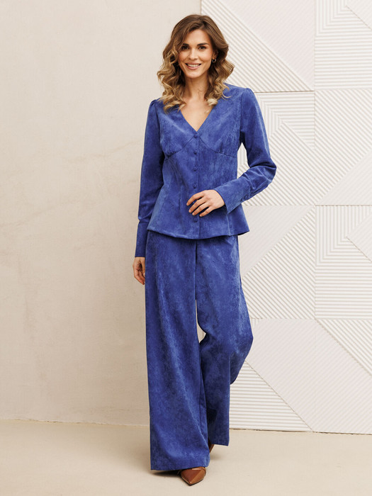 Костюм состоит из блузки и брюк. Блузка оригинальная приталенного силуэта из вельветовой ткани. Перед с подрезом под грудью, сборкой в районе груди и талиевыми вытачками. Затсежка на петли и пуговицы. Горловина V-образной формы. Спинка со средним швом и талиевыми вытачками. Рукав втачной со сборкой по окату и с манжетой по низу. Манжета высокая с двумя петлями и пуговицами. Длина блузки - 63 см, длина рукава блузки - 64 см. Брюки палаццо с притачным поясом из мягкой вельветовой ткани. Спереди застежка гульфик на молнии и петлей и пуговицей по поясу. По задней частям брюк вытачки. Пояс с резинкой в боковых частях. Брюки с заутюженными стрелками. Длина брюк с учетом пояса - 109 см.