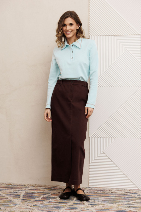 Костюм состоит из джемпера и юбки. Джемпер слегка приталенного силуэта с воротником поло из  трикотажного полотна. Рукав втачной одношовный.  Длина джемпера - 57 см, длина рукава - 60 см. Юбка прямого силуэта выполненная из джинсовой ткани. Передняя честь юбки с вытачками, со средним швом и застежкой гульфиком на молнии и щлицей спереди. Задняя часть юбки с вытачками. Юбка на притачном поясе с затежкой на петлю и пуговицу спереди и резинками по бокам.  Длина юбки с учетом пояса - 90 см.