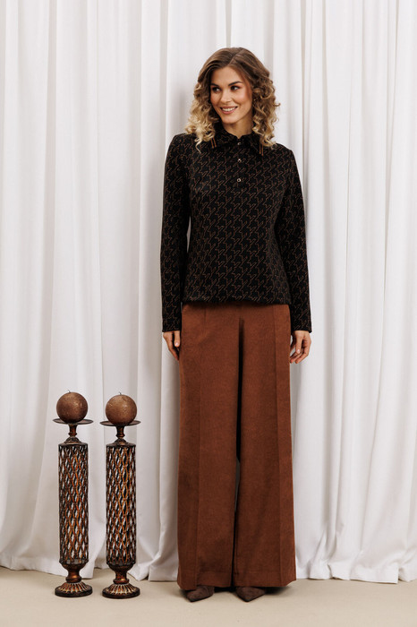 Костюм состоит из джемпера и брюк. Джемпер прямого силуэта из плотного трикотажного полотна с оригинальным рисунком из люрекса. Перед с застежкой поло и нагрудными вытачками. По воротнику настрочена декоративная тесьма. Длина джемпера  - 60 см, длина рукава - 61 см. Брюки палаццо с притачным поясом из мягкой вельветовой ткани. Спереди застежка гульфик на молнии и петлей и пуговицей по поясу. По задней частям брюк вытачки. Пояс с резинкой в боковых частях. Брюки с заутюженными стрелками. Длина брюк с учетом пояса - 109 см.