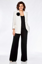Костюм состоит из джемпера и брюк. Джемпер прямого силуэта из трикотажного ажурного полотна. Перед с застежкой поло и нагрудными вытачками. По воротнику и низу рукава настрочена декоративная тесьма. Длина джемпера - 69 см, длина рукава - 32 см. Брюки палаццо с притачным поясом из мягкой вельветовой ткани. Спереди застежка гульфик на молнии и петлей и пуговицей по поясу. По задней частям брюк вытачки. Пояс с резинкой в боковых частях. Брюки с заутюженными стрелками. Длина брюк с учетом пояса - 109 см.