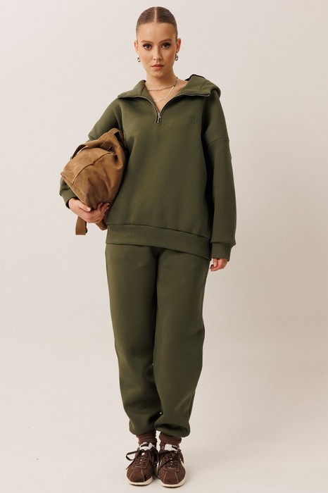 " Этот спортивный костюм от GOwear отлично подойдет для дома, прогулок, путешествий и отдыха. Сделан из теплой, комфортной ткани. Состоит из джемпера и брюк. Джемпер имеет  двойной капюшон и короткую застежку - молнию черного контрастного цвета по центру переда. На переде с левой стороны выполнена вышивка в цвет ткани. Джемпер имеет прямой силуэт. Низ джемпера и манжеты выполнены из кашкорсе.  Брюки зауженные к низу с притачным поясом (резинка и шнурок внутри). Брюки с боковыми карманами. По низу брюк – манжеты.