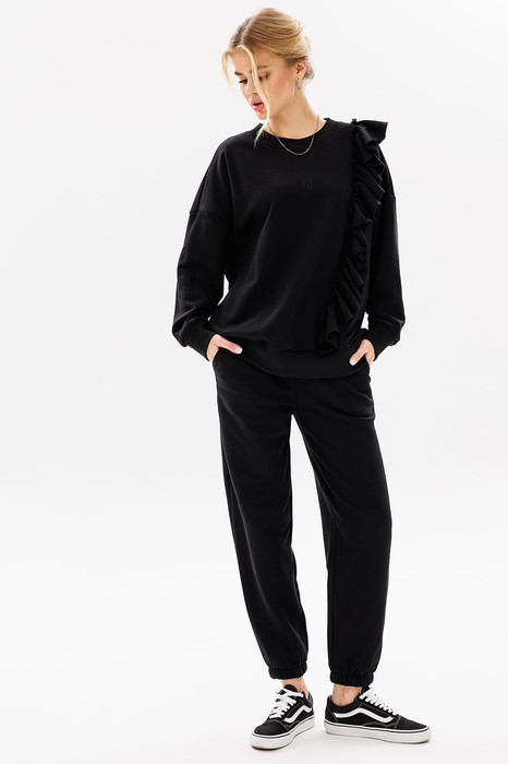 Современный, женственный костюм, покроя oversize из комфортной ткани (футера пенье). Костюм состоит из джоггеров и свободного свитшота с воланом. Волан с необработанным краем (укреплён строчкой для надежности) пришит асимметрично на левой стороне изделия. Свитшот имеет спущенную линию плеча, прямой силуэт и притачную манжету по низу изделия. По центру переда вышивка – логотип в цвет ткани. Рукава с притачной по низу манжетой. Бейка горловины, низ изделия и манжеты рукавов выполнены из ткани - компаньона кошкорсе. Брюки с притачным поясом, резинкой внутри. Передняя половинка брюк с удобными боковыми карманами. Низ брюк присобран на резинку.