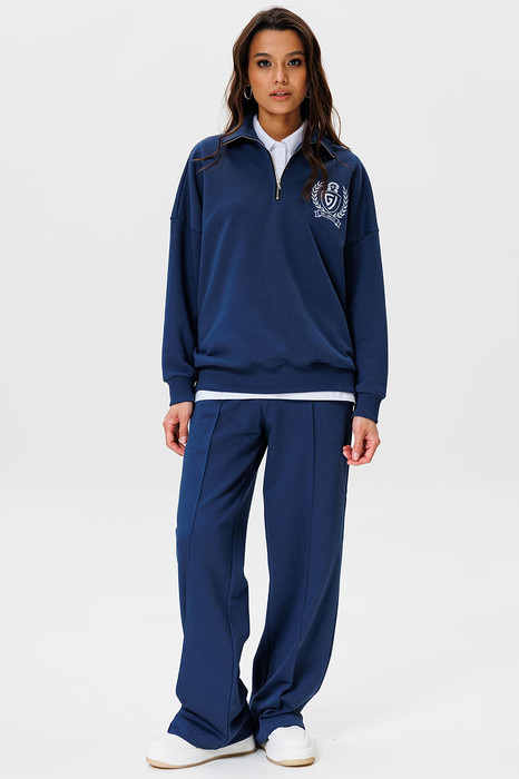 Женский яркий, повседневный костюм, состоящий из оверсайз свитшота с контрастной вышивкой и брюк со стрелками. Это находка для тех, кто ценит свободу, стиль и не хочет отказывать себе в комфорте 24/7.