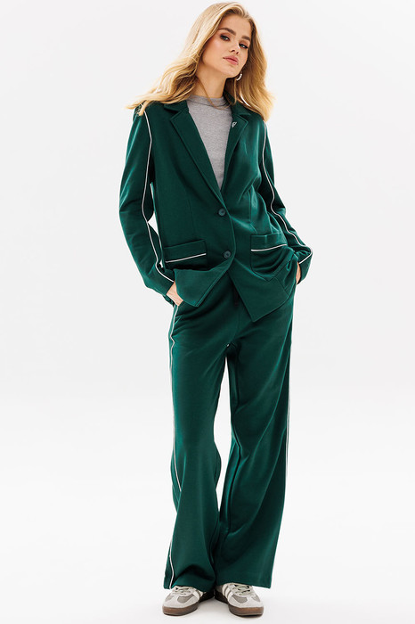 Костюм в стиле smart casual с контрастными кантами в швах создаст в меру строгий и одновременно расслабленный образ как для работы, так и торжественного мероприятия.