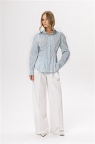 Блузка с центральной застежкой на петли и пуговицы, отложным воротником. По переду втачная планка. Спинка цельная. Рукав втачной, короткий. Юбка без пояса, с застежкой на одну петлю и пуговицу по передним полотнищам и на потайную молнию в левом боковом шве. Переднее полотнище состоит из двух асимметричных деталей, со средним швом, заканчивающимся шлицей. Заднее полотнище с талиевыми вытачками. Юбка с декоративным поясом, закрепленным на переднем и заднем полотнище.