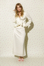 Блузка с центральной потайной застежкой на петли и пуговицы, втачным воротником с отрезной стойкой. Плечевой шов переходящий на перед. Спинка цельная. Рукав втачной, длинный, с отрезной манжетой. Жилет прямого силуэта, на бретелях, с фигурным вырезом горловины. Бретели зафиксированы к жилету петлями и пуговицами. Брюки прямые, с отрезным поясом, по спинке пояс присборен на резинку. На передних половинках расположены карманы. Вход в карман наклонный к боковому шву. Застежка- гульфик. Комплект со съемным поясом.