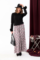 Жакет с центральной двубортной застежкой на пришивные кнопки, отложным воротником и лацканами пиджачного типа. По переду с рельефами, выходящими из проймы, талиевыми вытачками, прорезными карманами с клапанами и двумя обтачками. Спинка со средним швом, рельефами, выходящими из проймы. Рукав втачной, длинный. Брюки с отрезным поясом. Передние половинки с прорезными карманами в рамку, вход в карман параллельно к боковому шву. Застежка гульфик. Костюм со съемным поясом.