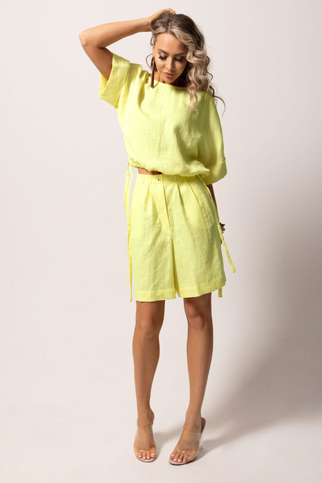 Блузка с застежкой на навесную петлю и пуговицу по горловине спинки, без воротника, с круглым вырезом горловины. По горловине спинки -вырез каелька. Рукав цельнокроенный, короткий, с отложной манжетой. По низу блузки- кулиса с завязками. Шорты прямые, без пояса. По верхнему краю шорт- шлевки. В боковых швах расположены карманы.
