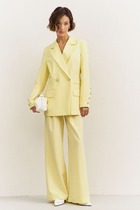 Блузон с центральной застежкой на петли и пуговицы, с втачным воротником и отрезной стойкой. По шву притачивания планки- рюши. По низу блузона- пояс. Плечо спущенное. Спинка цельная. Рукав втачной, длинный, с отрезной манжетой. Брюки зауженные к низу, с отрезным поясом, на поясе расположены шлевки. По спинке пояс присборен на резинку. По боковым швам расположены карманы. Вход в карман наклонный к боковому шву. Передние половинки брюк с двумя односторонними складками. Застежка гульфик.