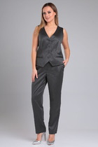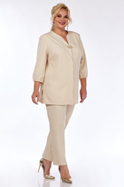 Жакет с центральной застежкой на петли и пуговицы, втачным воротником и отложным лацканом пиджачного типа. По переду нагрудные вытачки и накладные карманы. Спинка со средним швом. Брюки- с отрезным поясом, на поясе расположены шлевки. По спинке пояс присборен на резинку. По боковым швам расположены карманы. Вход в карман наклонный к боковому шву. По передним половинкам, по шву притачивания пояса- односторонние складки. Застежка гульфик. Комплект со съемным поясом.