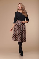Жакет с центральной застежкой на петли и пуговицы, втачным воротником и отложным лацканом пиджачного типа. По переду нагрудные вытачки и накладные карманы. Спинка со средним швом. Брюки- с отрезным поясом, на поясе расположены шлевки. По спинке пояс присборен на резинку. По боковым швам расположены карманы.  Вход в карман наклонный к боковому шву. По передним половинкам, по шву притачивания пояса- односторонние складки. Застежка гульфик. Комплект со съемным поясом.