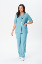 Жакет прямого силуэта с центральной двубортной застежкой на петли и пуговицы, с втачным воротником и отложными лацканами пиджачного типа. По переду с рельефами, выходящими из проймы. На уровне линии талии расположены настрочные клапаны. Спинка со средним швом, рельефами, выходящими из проймы. Рукав втачной, длинный. Брюки прямые, с отрезным поясом. По спинке и частично по переду пояс присборен на резинку.