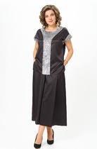 Блузон с застежкой на навесную петлю и пуговицу по горловине спинки, без воротника, с круглым вырезом горловины. По переду- кулиса со шнуром- завязкой. Спинка со средним швом. Рукав втачной, длинный. Брюки прямые, с отрезным поясом. Пояс присборен на резинку.