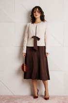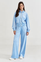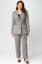 Блузон с центральной застежкой на петли и пуговицы, втачным воротником с отрезной стойкой. По переду с нагрудными вытачками, спинка цельная, по боковым швам- разрезы. Рукав втачной, длинный, с отрезной манжетой. Топ без воротника, с V-образным вырезом горловины. По переду с нагрудными вытачками. Брюки прямые, с отрезным поясом. Пояс присборен на резинку. Передние половинки с карманами. Вход в карман наклонный к боковому шву.