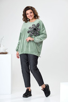 Жилет с центральной застежкой на петли и пуговицы. По переду с рельефами, выходящими из проймы и талиевыми вытачками, прорезными карманами с листочками. По спинке со средним швом, рельефами, выходящими из проймы. Полочки жилета на подкладке. Брюки прямые, с отрезным поясом. Пояс присборен на резинку. На передних половинках расположены карманы. Вход в карман наклонный к боковому шву.