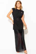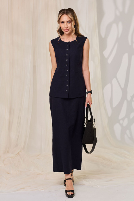 Жилет с центральной застежкой на петли и пуговицы, без воротника с круглым вырезом горловины. По переду с рельефами, выходящими из проймы, прорезными карманами с листочками, расположенными на уровне линии бедер. По спинке со средним швом ,рельефами, выходящими из проймы. Юбка без пояса, верхний срез обработан обтачками. Заднее полотнище со средним швом, заканчивающимся шлицей.