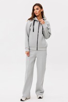 Жакет с центральной двубортной застежкой на пришивные кнопки, без воротника с отложными лацканами. По переду с рельефами, выходящими из проймы, талиевыми вытачками. Спинка со средним швом, рельефами, выходящими из проймы, талиевыми вытачками. Рукав втачной, длинный. Брюки с отрезным поясом, на поясе расположены шлевки. В боковых швах расположены карманы. Вход в карман наклонный к боковому шву. Застежка гульфик. Пояс в области спинки присборен на резинку. Костюм со съемным декоративным поясом. Декоративный пояс из кожзама, декорирован бахромой.