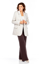 Жакет с центральной застежкой на петли и пуговицы, втачным воротником и лацканом пиджачного типа. По переду с талиевыми и нагрудными вытачками. На уровне линии бедер расположены прорезные карманы с листочкой и клапаном. Из талиевых вытачек выходят пояски с пряжками. По спинке со средним швом, талиевыми вытачками. Рукав втачной, длинный. Брюки- с отрезным поясом со шлевками, застежка- гульфик, верх брюк в области спинки присборен на резинку. По боковым швам расположены карманы. Вход в карман наклонный к боковому шву.