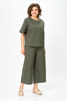 Блузка с центральной застежкой на завязки, без воротника, с V-образным вырезом горловины. По полочкам с отрезными планками, на которых закреплены завязки. Спинка цельная. Плечо спущенное. Рукав втачной, 3/4. Брюки с отрезным поясом. Пояс присборен на резинку. На передних половинках расположены карманы, вход в карман наклонный к боковому шву.
