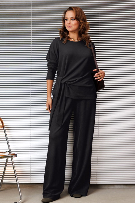 Джемпер свободного силуэта, вырез горловины округлый. Рукав со спущенной проймой, длинный. По талии сборка и завязки, которые являются декором изделия. Джемпер без застежки.