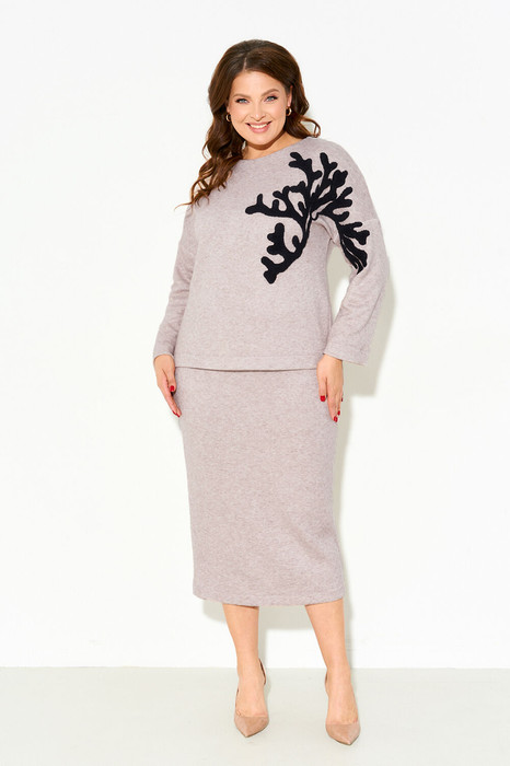 Костюм женский, состоящий из джемпера и юбки. Джемпер полуприлегающего силуэта из мягкого трикотажного полотна с добавлением ангоры со втачными немного спущенными рукавами и округлым вырезом горловины. По переду дизайнерская вышивка. Юбка полуприлегающего силуэта, зауженная книзу, на эластичной подкладке с притачным поясом на резинке; по спинке шлица. Рекомендована бережная стирка при t 30; глажение при максимальной температуре прессующей поверхности утюга не более 110 С.
