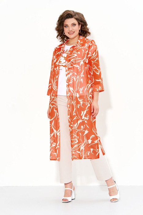 Костюм женский с брюками, футболкой и удлиненной рубашкой из шифона. Рубашка прямого силуэта со втачными рукавами и разрезами по бокам, застежка-планка на петли и пуговицы. Базовая трикотажная футболка полуприлегающего силуэта с небольшими втачными рукавами и декоративной печатью. Футболка прошла тестовую стирку при температуре 30 градусов: печать не линяет и не тяет цвет. Брюки полуприлегающего силуэта заужены к низу, притачной пояс на резинке по бокам, застежка на молнию, петлю и пуговицу, в боковых швах карманы. Уход за изделиями из шифона: