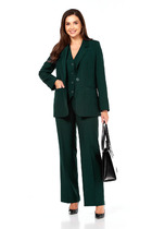 Женский костюм, состоящий из джемпера и брюк. Джемпер выполнен из мягкого трикотажа с добавлением ангоры, рукава со спущенной линией плеча, горловина округлой формы, по низу джемпера и рукавов - функциональные разрезы. Брюки выполнены из костюмной ткани с содержанием вискозы, прямые к низу, пояс притачной с резинками по бокам, в боковых швах функциональные карманы.