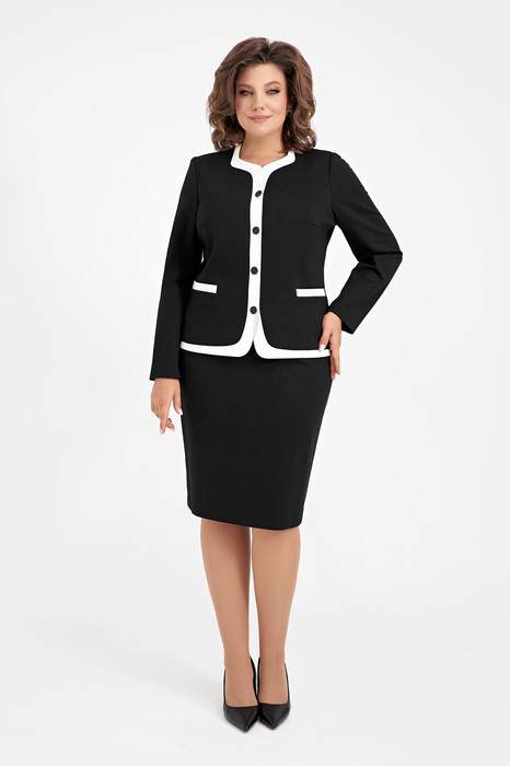Женский костюм, состоящий из жакета и юбки. Жакет полуприлегающего силуэта из трикотажа  средней плотности, частично на подкладке с плечевыми накладками и втачными рукавами, по переду функциональные накладные карманы, застежка на петли и пуговицы. Декор по планке, горловине и листочке кармана из ткани белого цвета. Юбка полуприлегающего силуэта на эластичной подкладке с притачным поясом, в боковые швы которого вставлена резинка для лучшего прилегания, по спинке шлица, застежка на молнию, петлю и пуговицу. Костюм полностью соответсвует заявленному размеру. Пожалуйста, пользуйтесь таблицей обмеров готового изделия. Белая ткань устойчива к перекрашиванию благодаря современным технологиям.                                                                  Рекомендована химчистка.