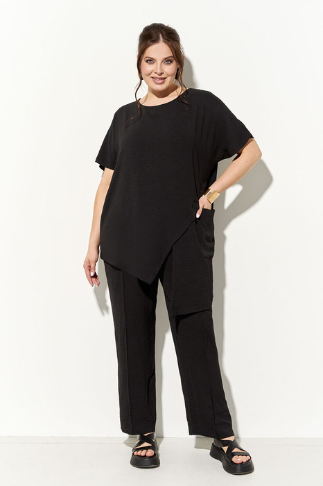 Костюм женский, состоящий из туники и брюк, выполнен из легкой струщейся ткани. Туника свободного силуэта, низ изделия ассиметричнной формы с накладным фукциональным карманом, спинка с акцентным треугольным вырезом. Брюки классические полуприлегающего силуэта заужены к низу, в боковых швах функциональные карманы, пояс притачной полностью на резинке. Костюм полностью соответсвтует заявленному размеру.