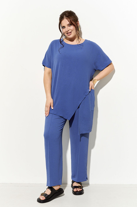 Костюм женский, состоящий из туники и брюк, выполнен из легкой струщейся ткани. Туника свободного силуэта, низ изделия ассиметричнной формы с накладным фукциональным карманом, спинка с акцентным треугольным вырезом. Брюки классические полуприлегающего силуэта заужены к низу, в боковых швах функциональные карманы, пояс притачной полностью на резинке. Костюм полностью соответсвтует заявленному размеру.
