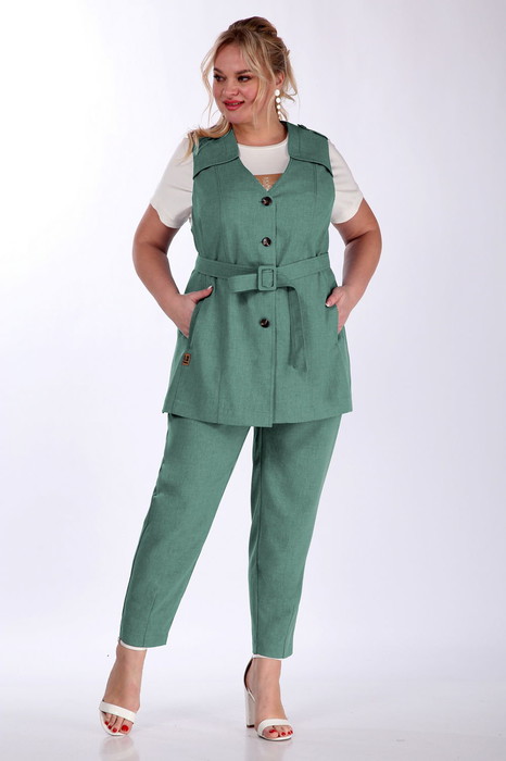 Комплект брючный 3-х предметный состоит из жилета, брюк и джемпера. Жилет из костюмно-плательной ткани прямого силуэта. Горловина V-образной формы, застежка центрально-бортовая на петли и пуговицы. В рельефах переда обработаны карманы. По переду фигурные отлетные кокетки. Спинка разрезная, с кокеткой. По боковым швам разрезы, по плечевым паты. Брюки средней посадки, заужены к низу за счет вытачек. По переду обработаны боковые карманы с подрезным бочком, по задним деталям фигурные накладные. Пояс в 58-62 размерах частично на резинке. Джемпер свободного силуэта, рукав цельнокроенный, дополнен печатью.