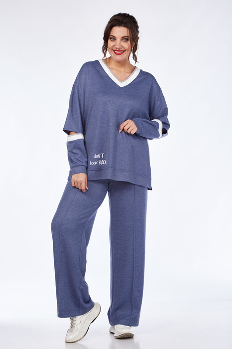 Костюм брючный 2-х предметный из трикотажного полотна. Джемпер свободного силуэта. Горловина V — образной формы, обработана довязом. Рукав спущенный длинный, с фигурными разрезами, декорированными довязами. Брюки средней посадки, пояс на резинке, обработаны боковые карманы. По передним деталям застрочен кант. Брюки прямого кроя. По низу джемпера и низу брюк — печать.