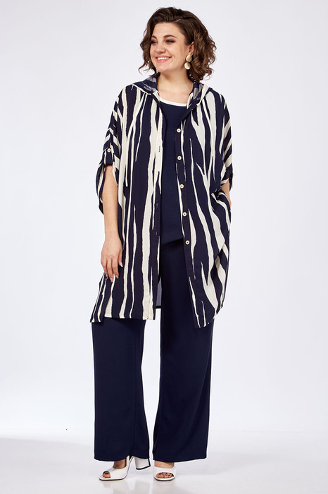 Комплект женский, брючный 3-х предметный, состоит из шазюбля, брюк и топа. Шазюбль свободного силуэта из шифона. Горловина оформлена капюшоном, застежка на петли-пуговицы. Рукава цельнокроеные по низу пата с пуговицей. В боковых швах обработаны кулисы и разрезы. Топ и брюки изготовлены из легкой костюмной ткани. По переду топа нагрудные вытачки, горловина круглой формы, обработана отделочной тканью. Внизу-нашивка. Брюки свободного кроя. Пояс на резинке, обработаны боковые карманы.