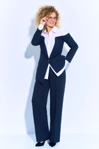 Костюм женский 2х — предметный выполнен из ажурного трикотажного полотна. Состоит из джемпера и юбки. Джемпер свободного силуэта горловина V-образной формы. По переду накладной карман. В боковых швах разрезы. Рукава спущенные, к низу обработана кулиса с декоративной тесьмой. Низ джемпера с перепадом длины. Юбка зауженная к низу, пояс цельнокроеный на резинке. Юбка на подкладке.