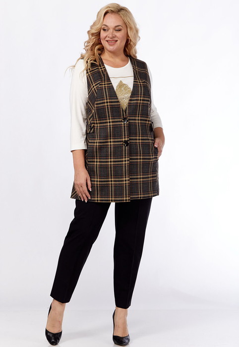 Костюм брючный 3х — предметный, состоит из жилетки, брюк и джемпера. Жилет выполнен из костюмной ткани в клеточку, прямого силуэта. Горловина V-образной формы. Застежка центральная на две петли и пуговицы. По переду фигурные рельефы в которых обработаны карманы. Спинка разрезная по линии талии, нижняя часть спинки с декоративной шлицей. В боковых имеются разрезы и паты переходящие на перед. Брюки классической посадки, заужены к низу. Пояс притачной частично на эластичной тесьме. Застежка на молнию и петлю с пуговицей. По передним деталям брюк обработаны карманы с подрезным бочком. Джемпер выполнен из вискозного полотна. Прямого силуэта. Рукав втачной. Дополнен дизайнерской печатью.
