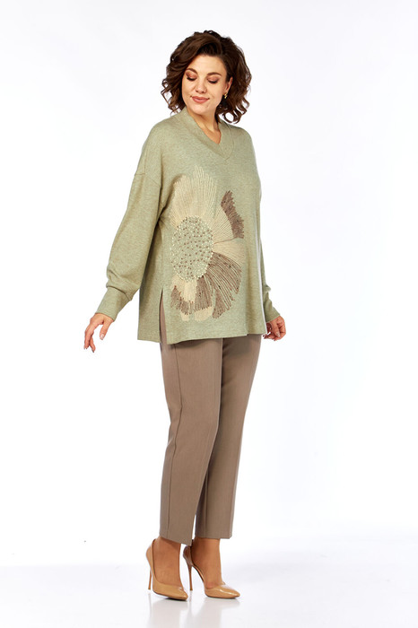 Комплект женский брючный, состоит из джемпера и брюк. Джемпер свободного кроя, изготовлен из трикотажного полотна. Горловина V-образной формы. На полочке-вышивка. Спинка цельнокроенная. Рукава спущенные, с манжетами по низу. В боковых швах-разрезы. Брюки классические из костюмной ткани. В брюках обработан пояс, частично на резинке. Застежка на молнию, петлю и пуговицу. В брюках обработаны боковые карманы. Сзади обработана кокетка.