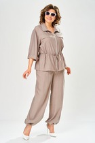 Комплект брючный, состоит из джемпера и брюк. Джемпер свободного кроя, изготовлен из трикотажного полотна. Горловина обработана воротником-стойкой и притачными планками с застежкой на петли и пуговицы. На полочке расположена вышивка. Рукава спущенные, по низу обработаны манжеты. По низу изделия притачная деталь с разрезами по бокам. Брюки изготовлены из хлопковой костюмной ткани под джинс В брюках обработан пояс, застежка на тесьму-молнию и петлю пуговицу. На задней части брюк кокетка и накладные карманы. На передней части боковые карманы.